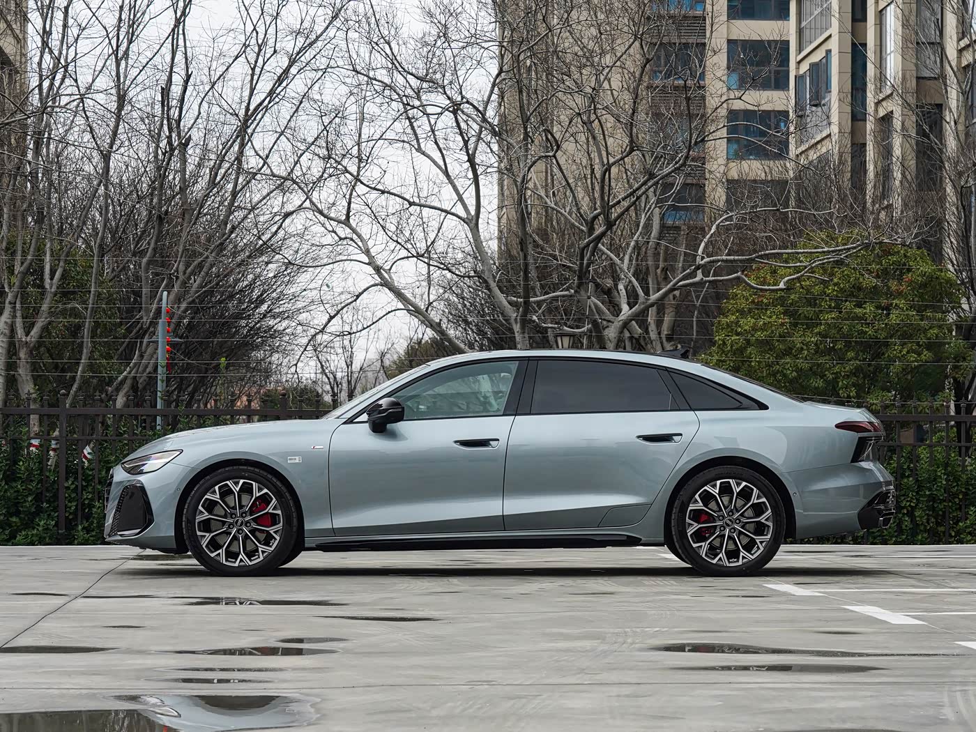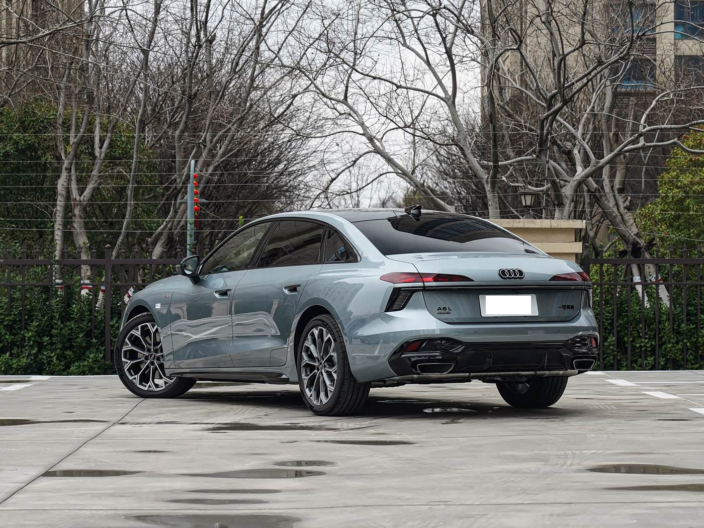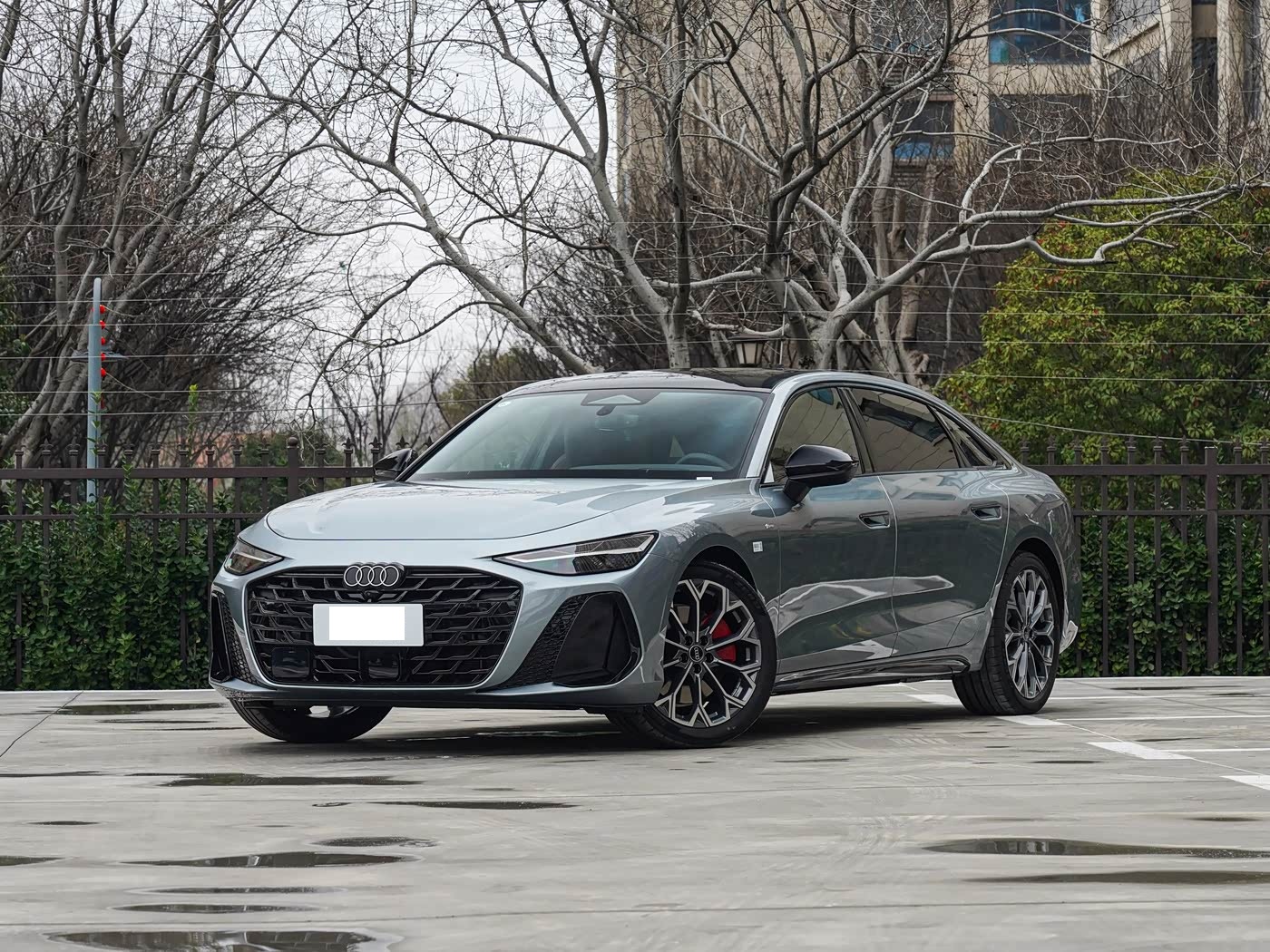 我们首先来看新车的外观设计方面,全新奥迪A6L采用致雅型与动感型双前脸设计,精准覆盖不同消费需求。致雅型延续经典镀铬格栅,横向饰条规整排布,营造出低调内敛的豪华质感,适配商务场景的庄重需求;动感型则配备全套熏黑运动套件,蜂窝状进气格栅配合熏黑前唇,尽显运动张力,满足年轻消费者的个性诉求。前脸整体线条简洁大气,摒弃冗余装饰,凸显奥迪家族的简约设计美学。两侧矩阵式LED大灯是车头的点睛之笔,造型锐利修长,支持多模式动态灯光切换,可投射导航箭头、行人警示符号及动态迎宾光影,夜间点亮仪式感拉满。