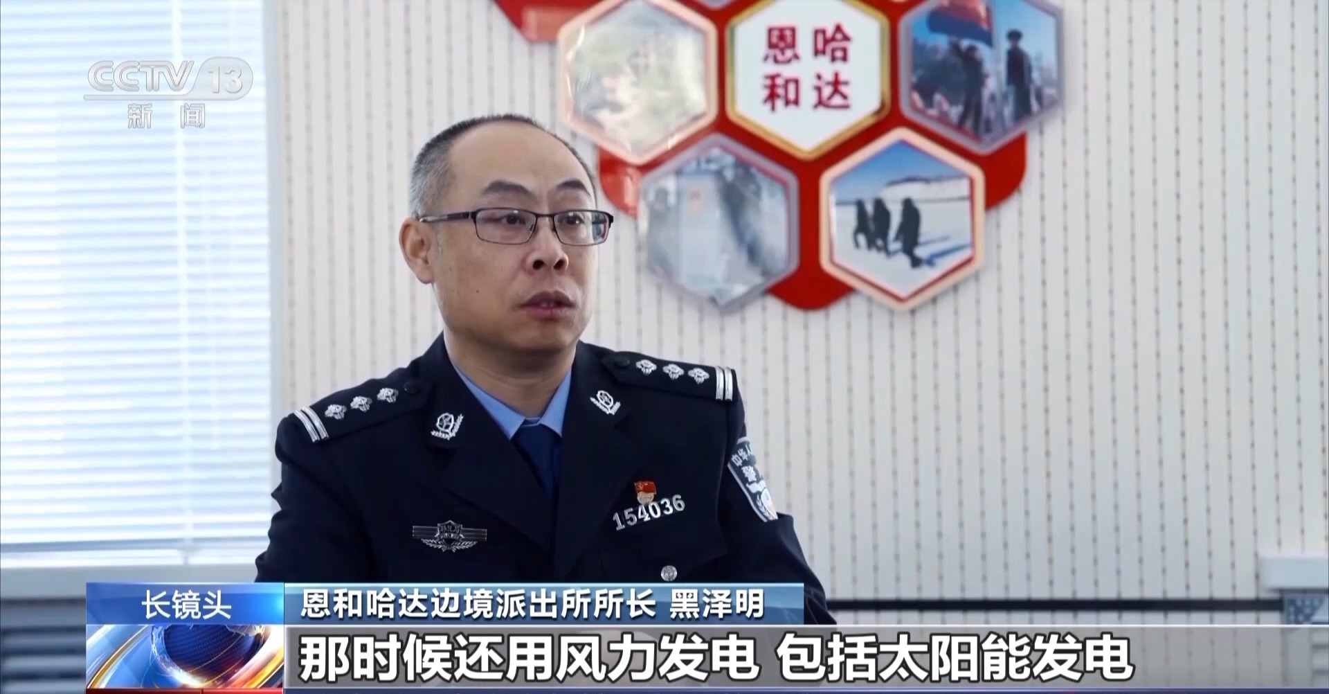恩和哈达边境派出所所长 黑泽明:刚来的时候2G的网络信号,打电话都打不通,上网也上不了,那时候还用风力发电,包括太阳能发电,后来2017年底我们通了4G网,视频会也能开了,所以说每一年都有变化,一年比一年好。我刚来的第二年,跟老一些的民警出去巡边,我们走那个冰道。冬天起冰包之后,车骑过去的话它会滑下去,所以说我们刨出两道车辙印,那车得压着车辙印过去。