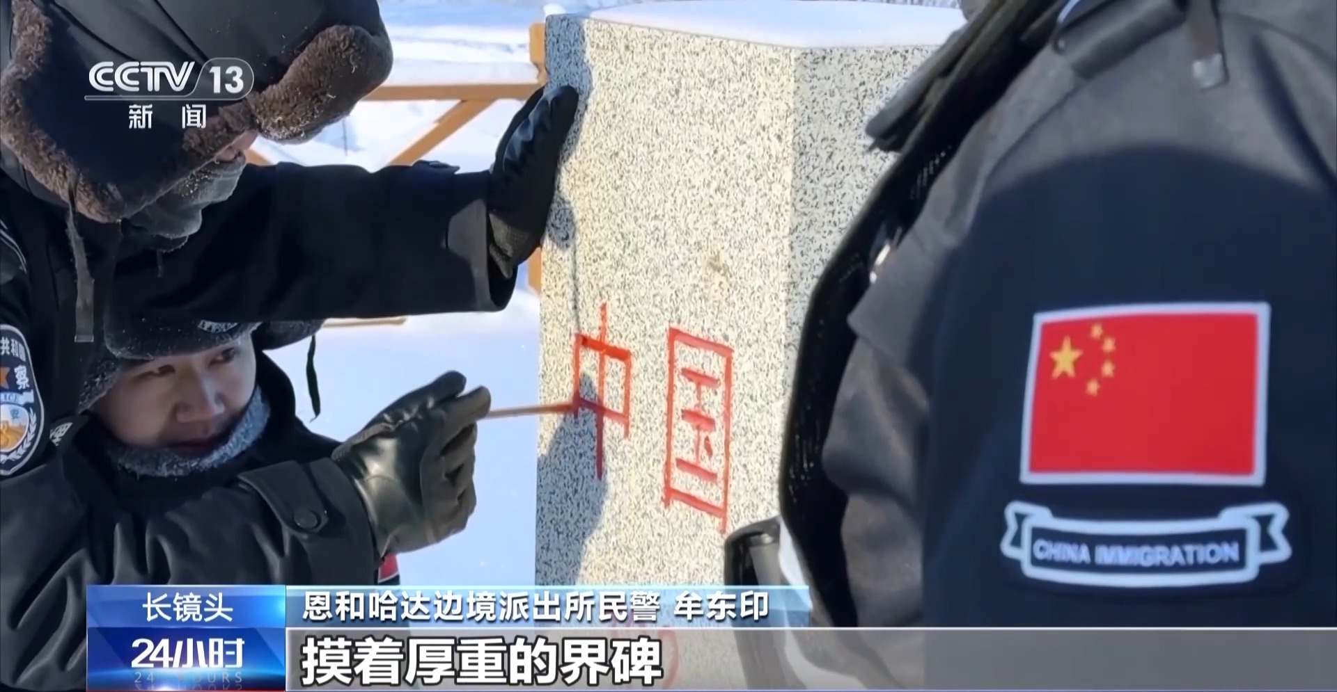 恩和哈达边境派出所民警 牟东印:刚开始比较艰难,也是跟着老民警,过程中慢慢学习适应技巧,第一次给界碑描红的时候,摸着厚重的界碑,看着中国两字逐渐清晰。当时心里激动、热泪盈眶,就是一种强烈的荣誉感、归属感在心里。