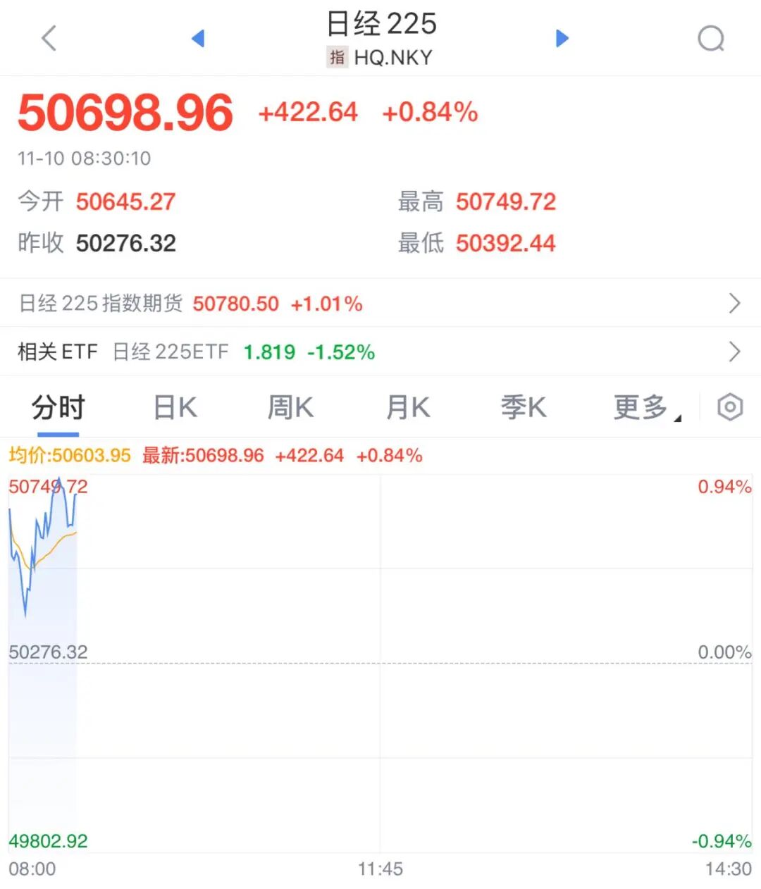 11月10日,日本股市早盘震荡走高,截至发稿,日经225指数涨0.84%。